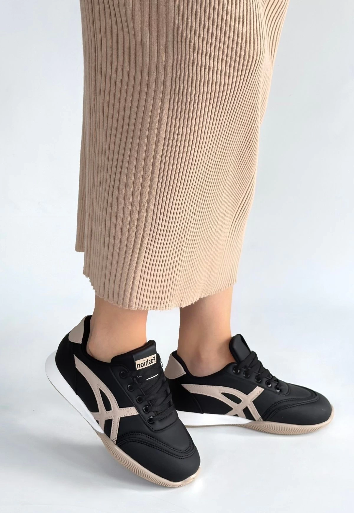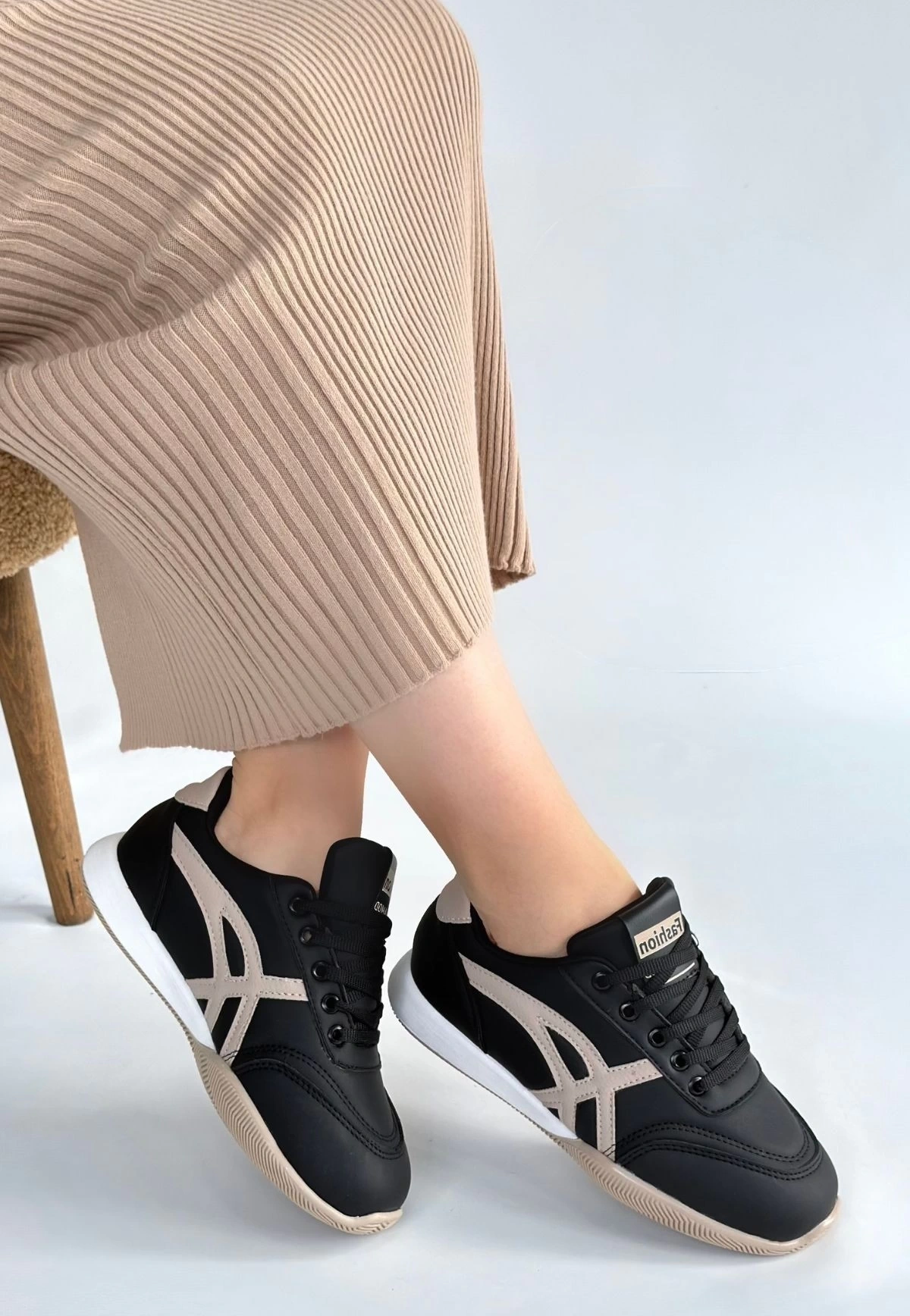 Zlay Siyah Cilt Bej Detaylı Bağcıklı Spor Ayakkabı